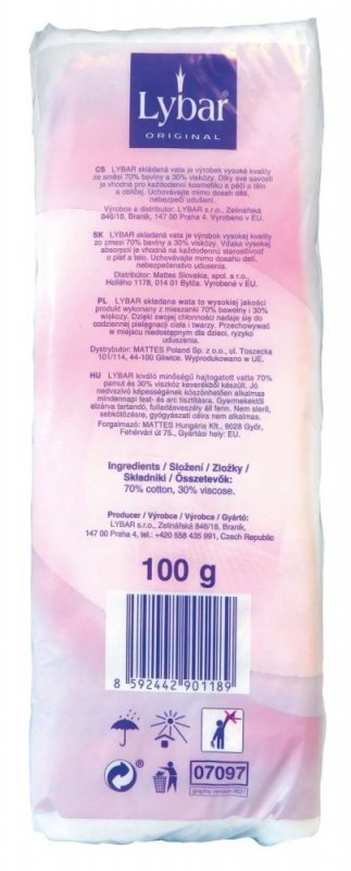 | LYBAR skládaná vata je výrobek vysoké kvality ze směsi 70% bavlny a 30% viskózy. Díky své savosti je vhodná pro každodenní kosmetiku a péči o tělo a obličej. | ![]() |